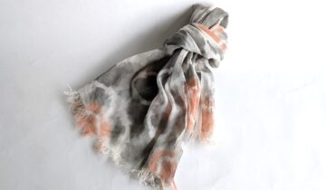 広げたときと巻いたときで表情が変わる、風流染のストール。鉱物由来のやさしい色合いが、日常の装いに静かなアクセントを添えます。
