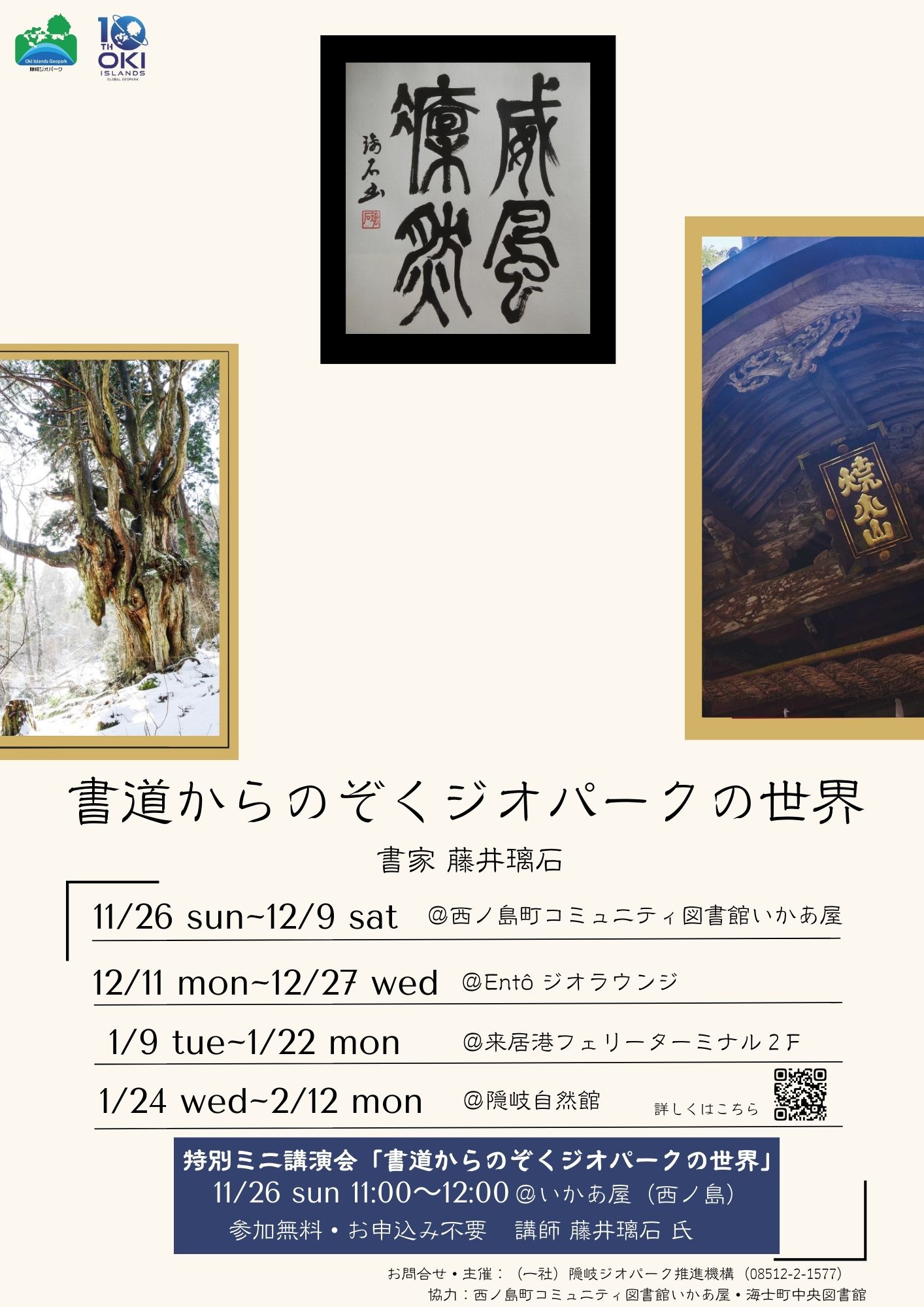 On display will be works and pictures by calligrapher Riseki Fujii that embody the feeling of Oki Islands Geopark sites.