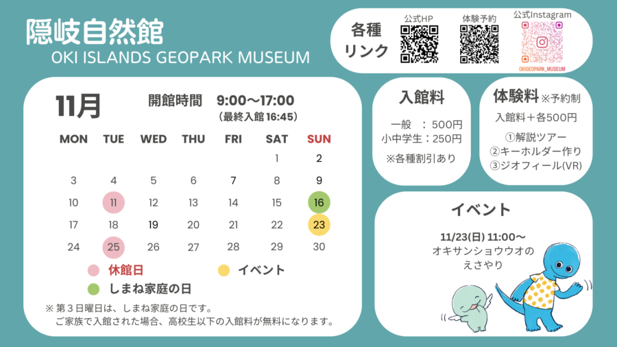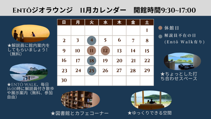 11月における隠岐自然館およびEntôジオラウンジの開館日についてお知らせします。