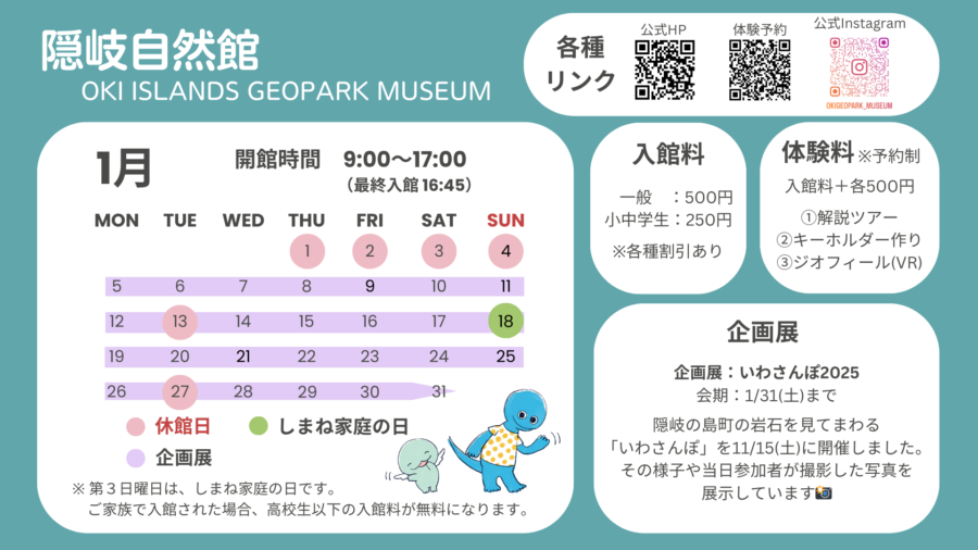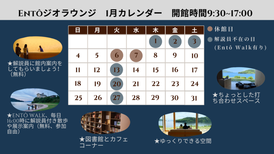 1月における隠岐自然館およびEntôジオラウンジの開館日についてお知らせします。