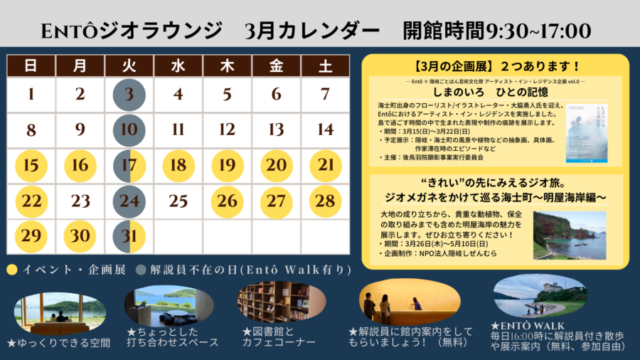 3 月における隠岐自然館およびEntôジオラウンジの開館日についてお知らせします。