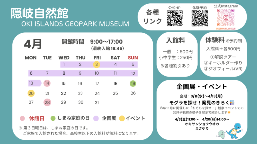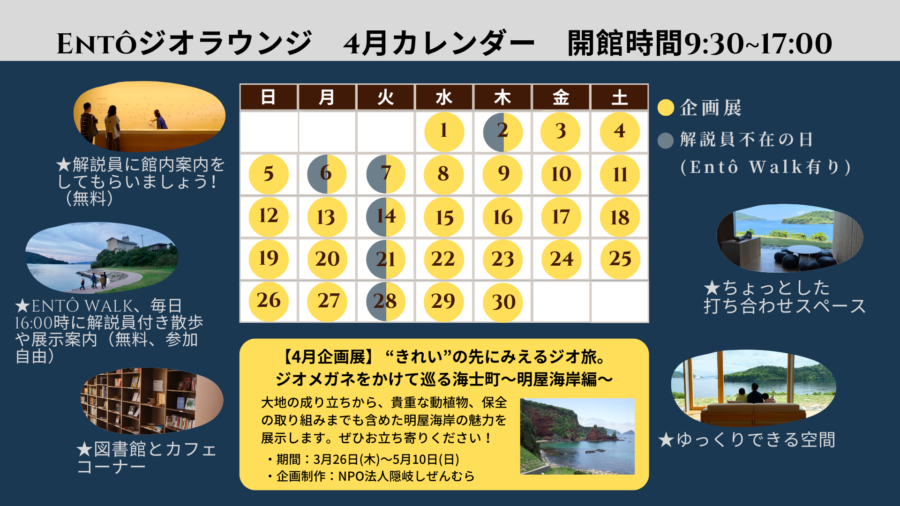 4月における隠岐自然館およびEntôジオラウンジの開館日についてお知らせします。